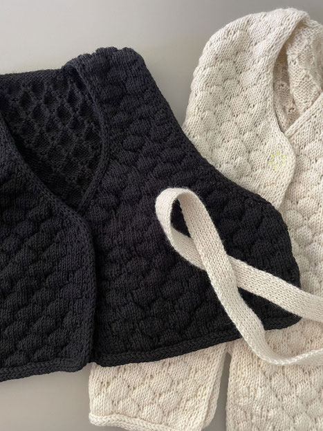 使用糸は amirisu Waltz(メリノウール100%)。バブル編みという引き上げ編みを使った模様を全面に配したオーバーサイズのベスト。アームホールも大きく開いていてブカっとしたシルエットが今どきね。