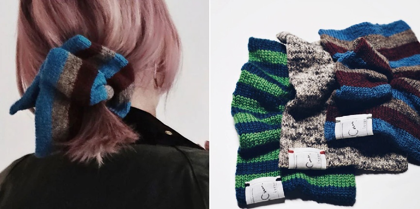 変わった形のシュシュです。長方形の中央に切れ込みが入った、ねじりこんにゃくのねじる前みたいな形。