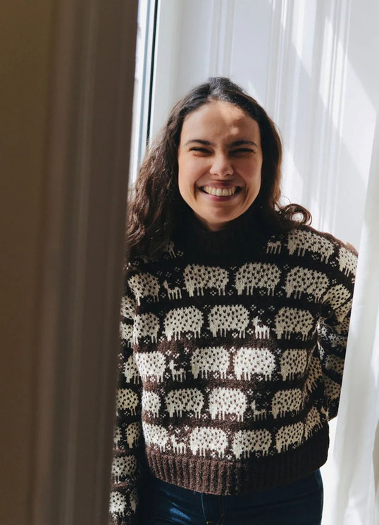 幾何学的な小さい羊が並んだ編み込み模様じゃなくて、ちょっと大きめな羊さんがぎっしり編みこまれたセーターです。間に仔羊がいるのがかわいいね。